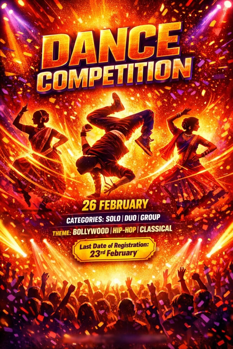 Participants can perform in their preferred category and style, ranging from energetic Bollywood routines to expressive classical performances and powerful hip-hop moves. The event focuses on stage presence, coordination, creativity, and overall performance.