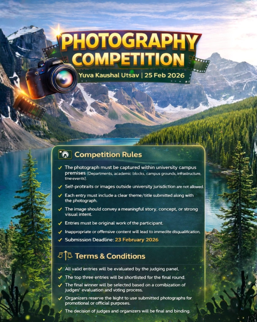 Participants are required to submit original photographs clicked within the university campus. This includes academic blocks, departments, infrastructure, campus grounds, events, or everyday student life moments.