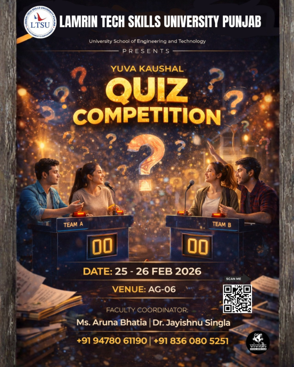 Lamrin Tech Skills University, Punjab is organizing an exciting Quiz Competition as part of Yuva Kaushal 2026, presented by the University School of Engineering and Technology. Scheduled for 25 and 26 February 2026, this event invites students to challenge their knowledge, speed, and teamwork in a competitive yet fun learning environment.