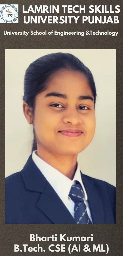 The University School of Engineering and Technology (USET), Lamrin Tech Skills University Punjab, proudly congratulates Bharti Kumari, a second-year B.Tech CSE (Artificial Intelligence & Machine Learning) student, on her selection for Stage IV of the YUVAI Global Youth Challenge under Viksit Bharat–2026.