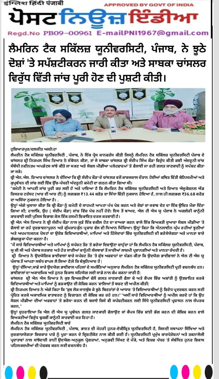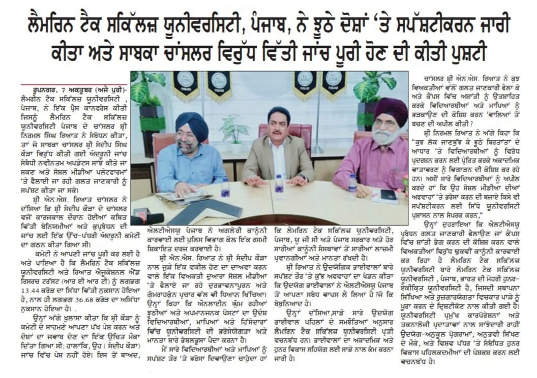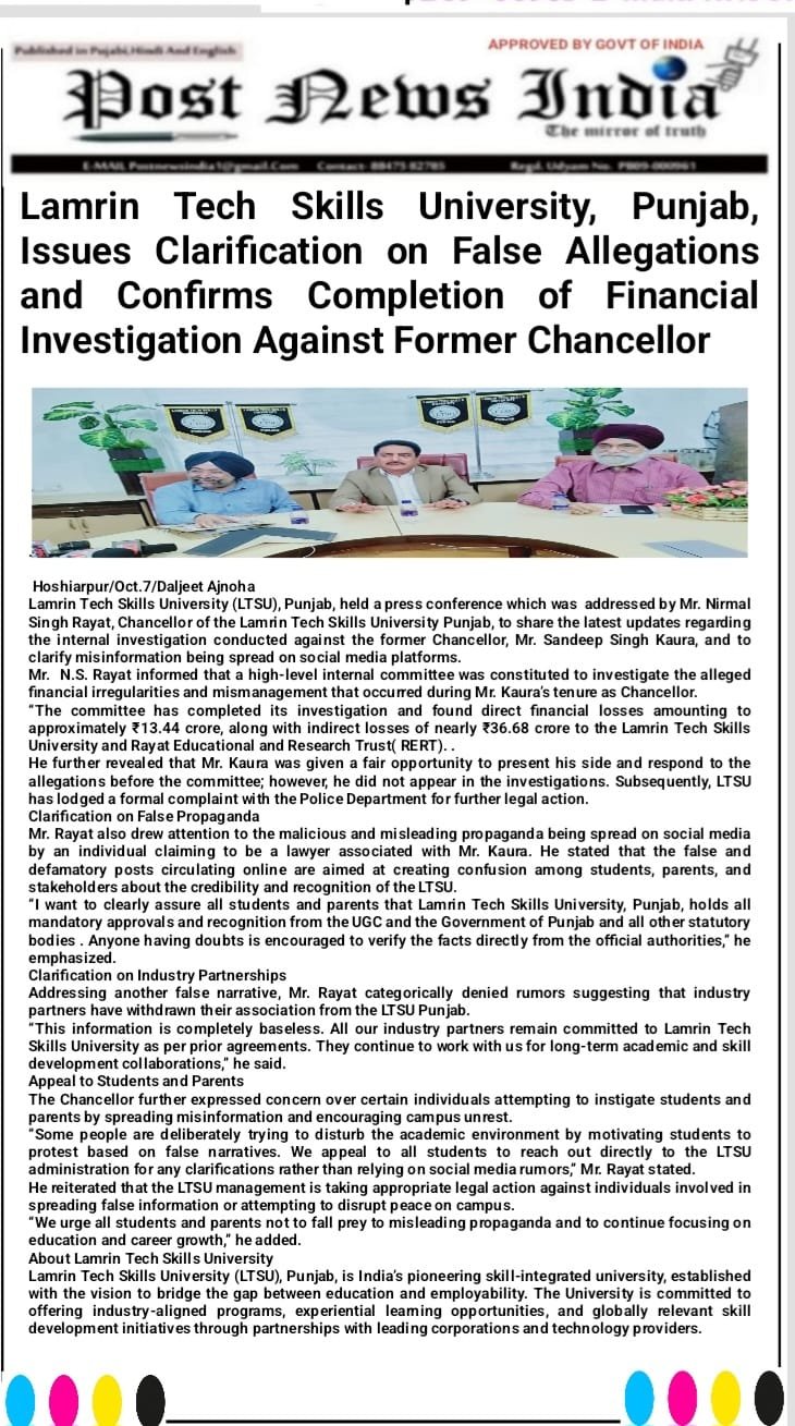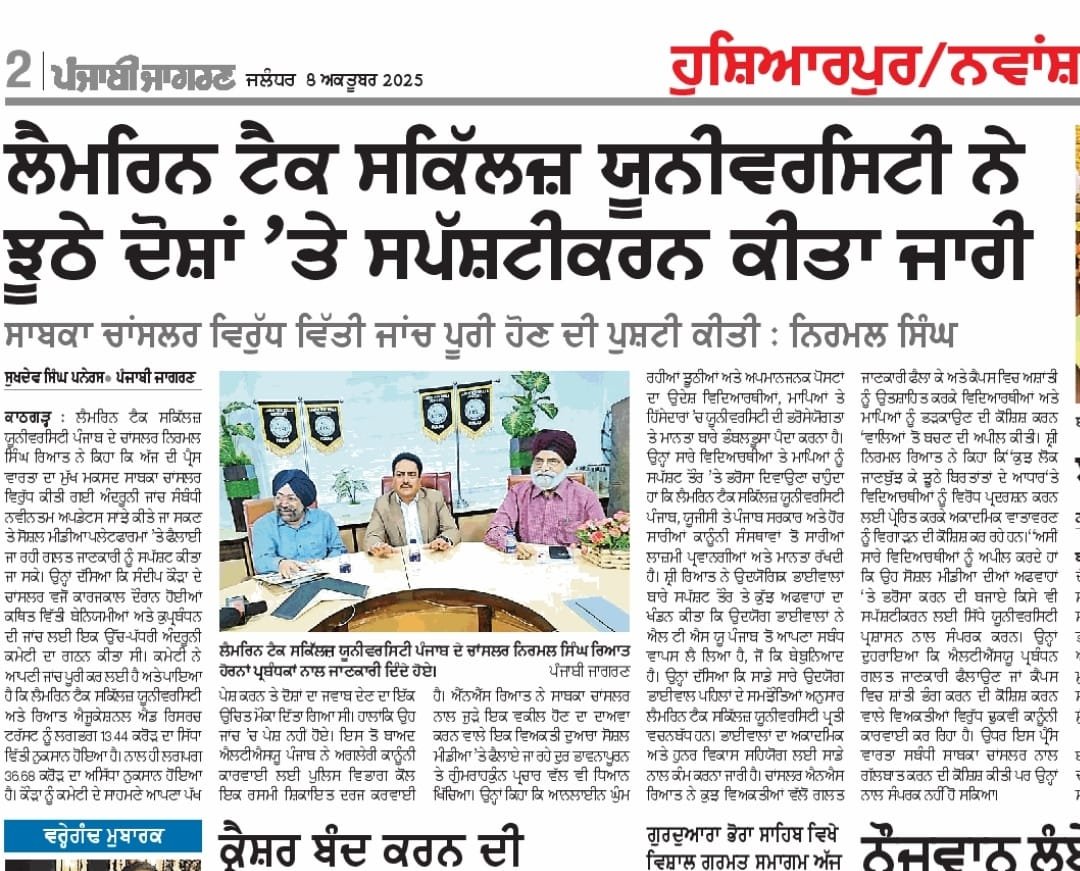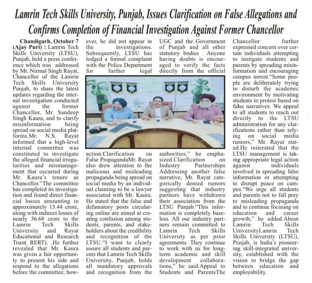 Press Coverage which was addressed by Mr. Nirmal Singh Rayat, Chancellor of the Lamrin Tech Skills University Punjab, to share the latest updates regarding the internal investigation conducted against the former Chancellor, Mr. Sandeep Singh Kaura, and to clarify misinformation being spread on social media platforms.