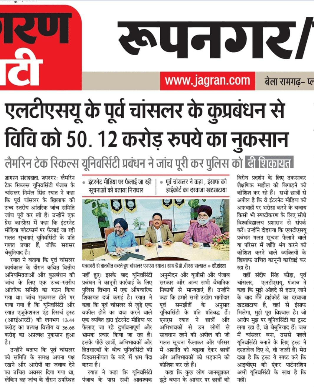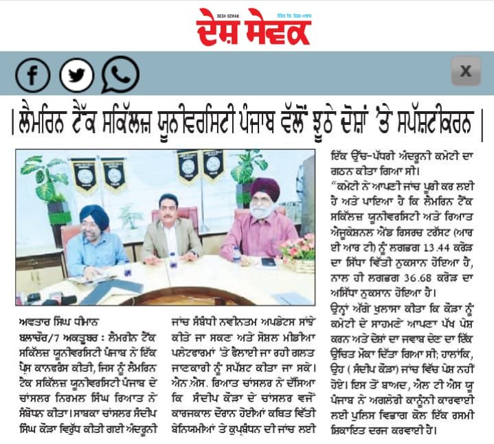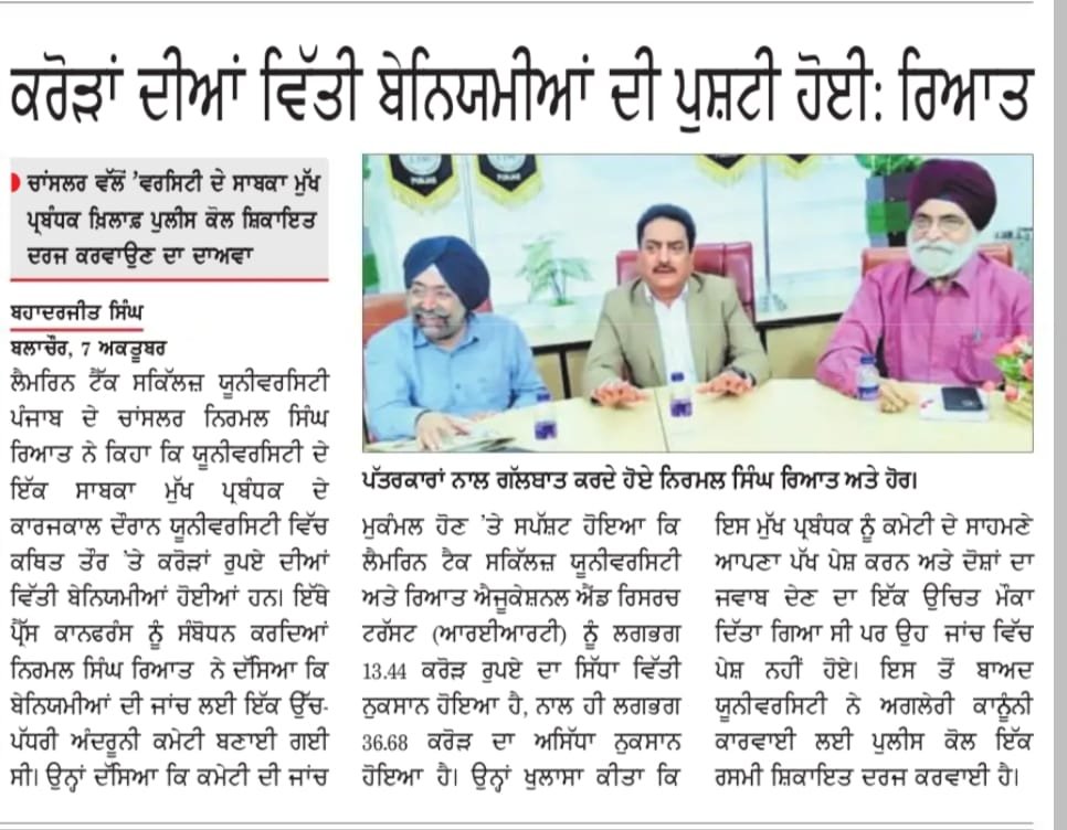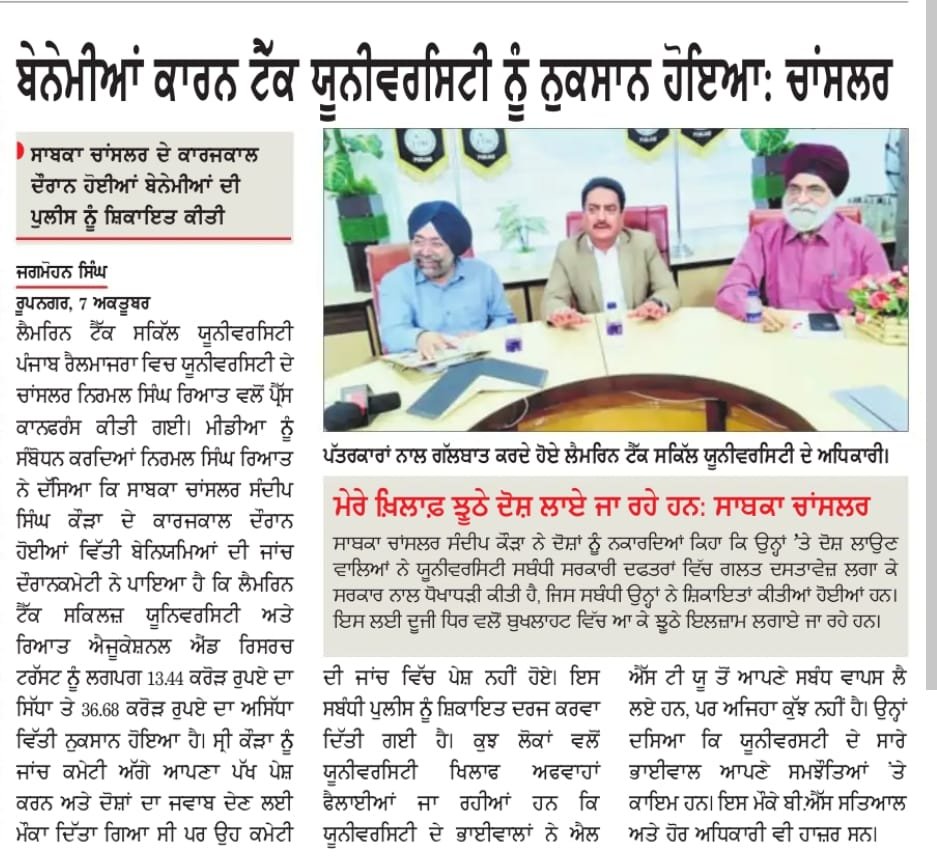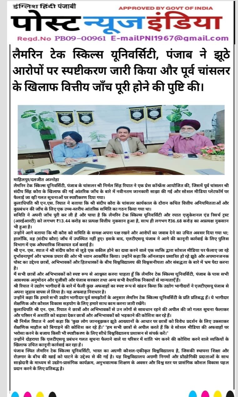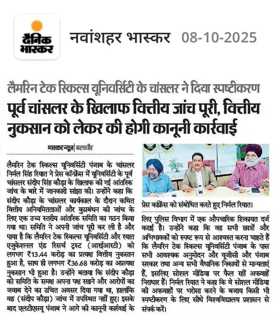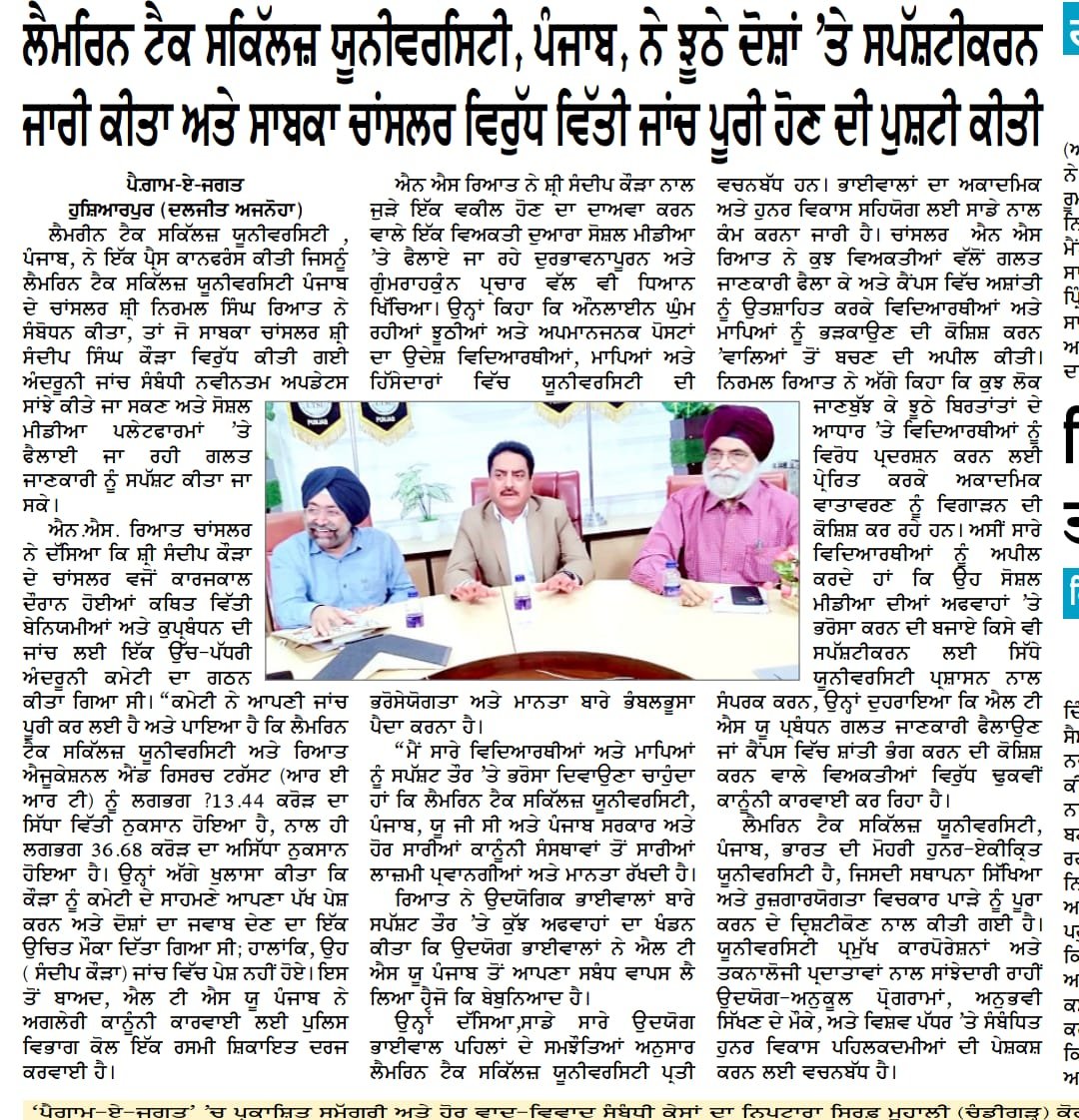 Press Coverage which was addressed by Mr. Nirmal Singh Rayat, Chancellor of the Lamrin Tech Skills University Punjab, to share the latest updates regarding the internal investigation conducted against the former Chancellor, Mr. Sandeep Singh Kaura, and to clarify misinformation being spread on social media platforms.