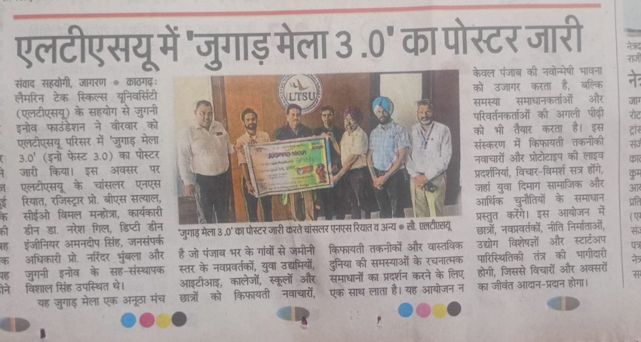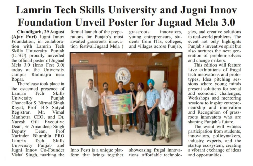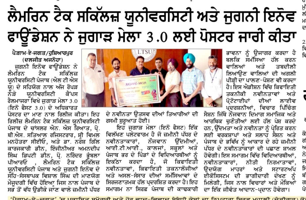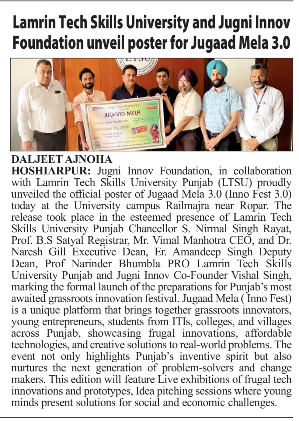 Jugni Innov Foundation, in collaboration with Lamrin Tech Skills University Punjab (LTSU) proudly unveiled the official poster of Jugaad Mela 3.0 (Inno Fest 3.0) today at the University campus Railmajra near Ropar. The release took place in the esteemed presence of Lamrin Tech Skills University Punjab Chancellor S. Nirmal Singh Rayat, Prof. B.S Satyal Registrar, Mr. Vimal Manhotra CEO, and Dr. Naresh Gill Executive Dean, Er. Amandeep Singh Deputy Dean, Prof Narinder Bhumbla PRO Lamrin Tech Skills University Punjab and Jugni Innov Co-Founder Vishal Singh, marking the formal launch of the preparations for Punjab’s most awaited grassroots innovation festival.