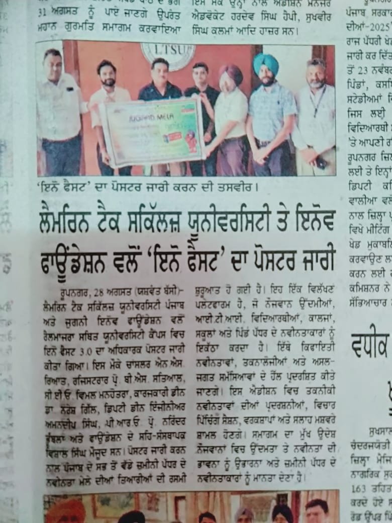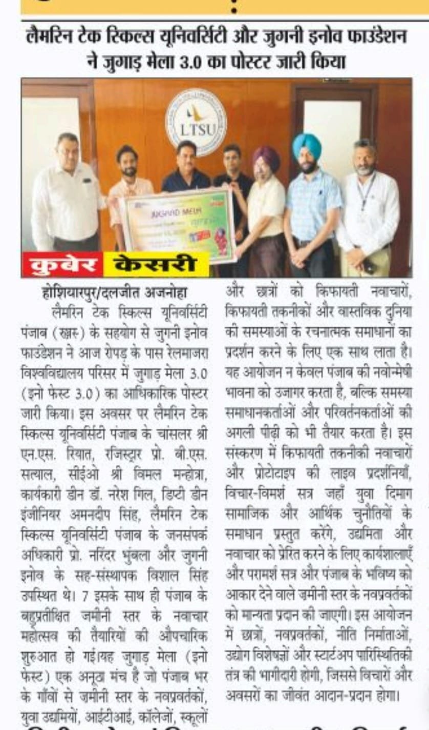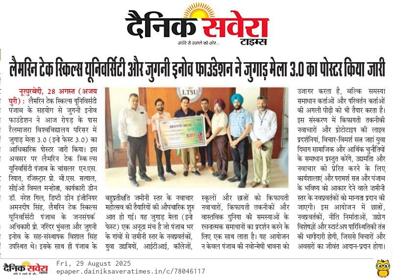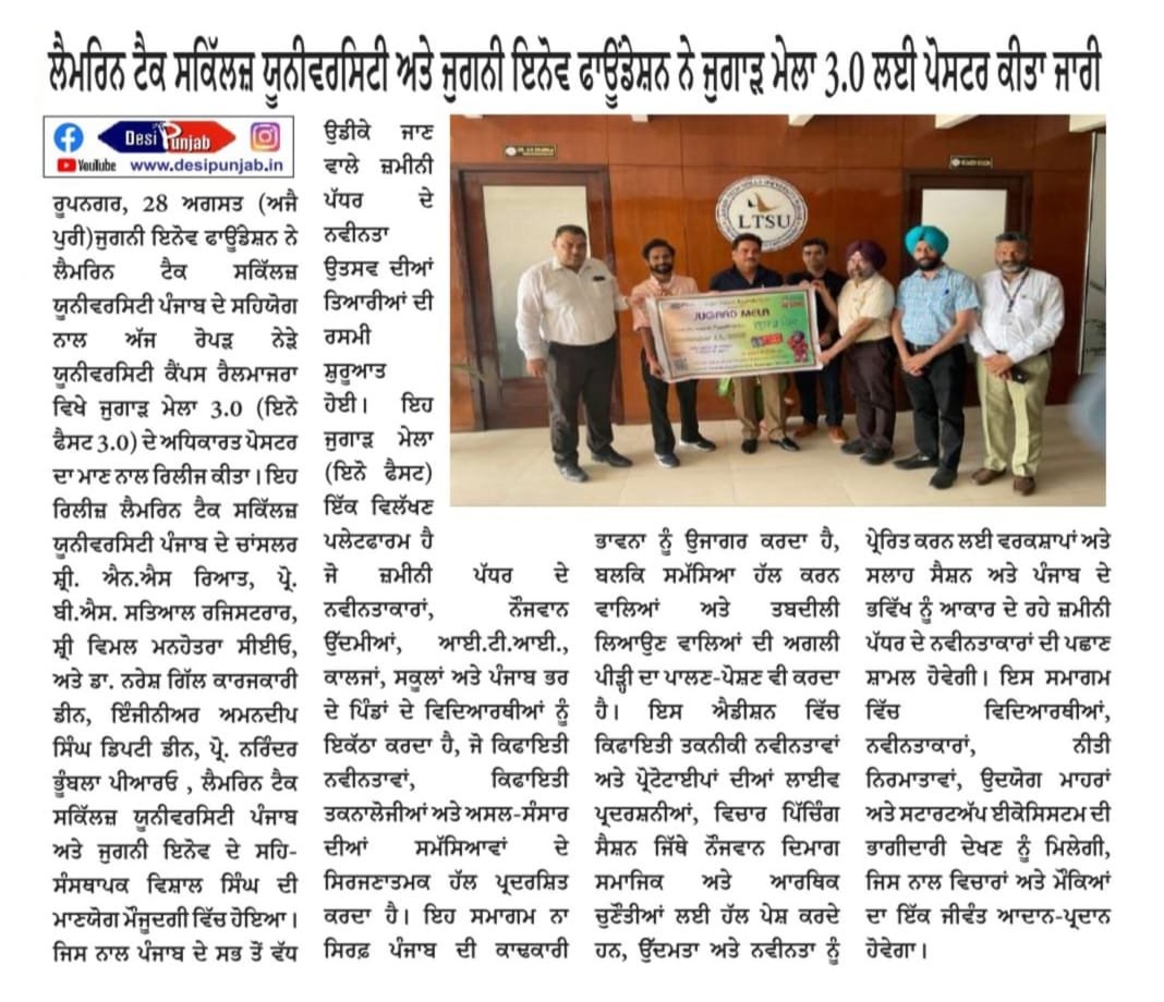 Jugni Innov Foundation, in collaboration with Lamrin Tech Skills University Punjab (LTSU) proudly unveiled the official poster of Jugaad Mela 3.0 (Inno Fest 3.0) today at the University campus Railmajra near Ropar. The release took place in the esteemed presence of Lamrin Tech Skills University Punjab Chancellor S. Nirmal Singh Rayat, Prof. B.S Satyal Registrar, Mr. Vimal Manhotra CEO, and Dr. Naresh Gill Executive Dean, Er. Amandeep Singh Deputy Dean, Prof Narinder Bhumbla PRO Lamrin Tech Skills University Punjab and Jugni Innov Co-Founder Vishal Singh, marking the formal launch of the preparations for Punjab’s most awaited grassroots innovation festival.