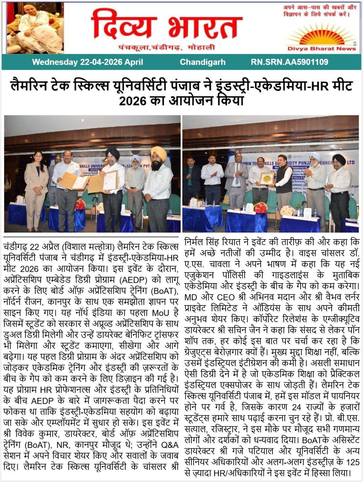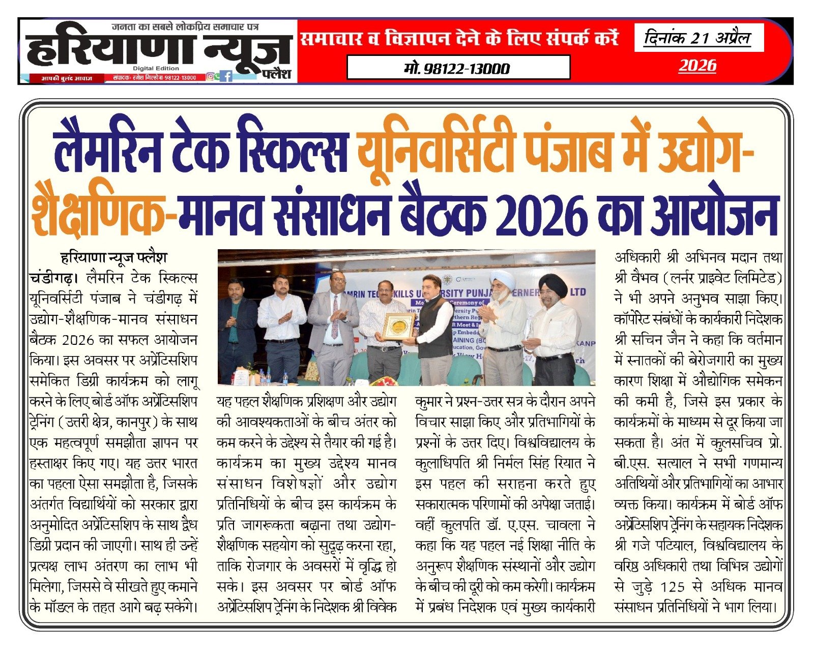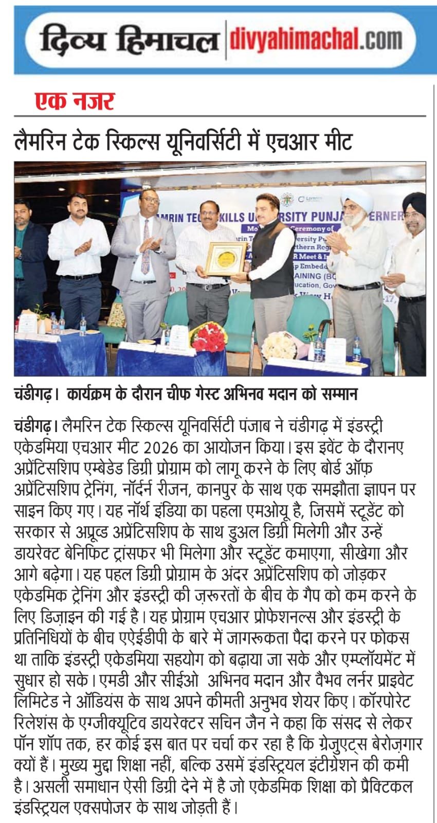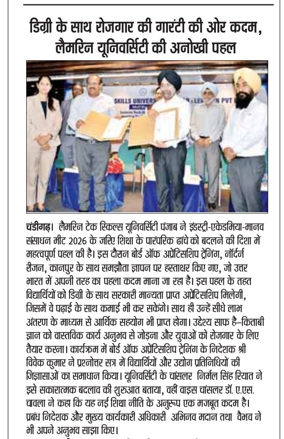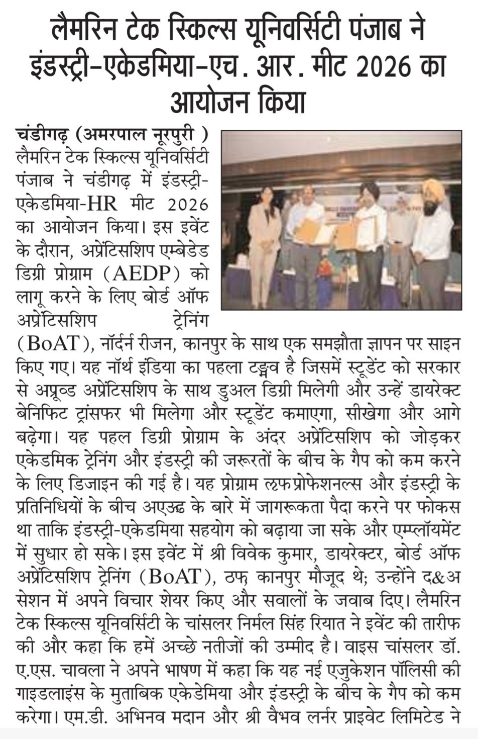 Lamrin Tech Skills University Punjab organized an Industry–Academia–HR Meet 2026 at Chandigarh. During the event, an MoU was signed with the Board of Apprenticeship Training (BoAT), Northern Region, Kanpur, for the implementation of Apprenticeship Embedded Degree Programmes (AEDP).It the First MoU in North India in which student will get dual degree with apprenticeship which is govt approved and also get direct benefit transfer and student will earn , learn and grow