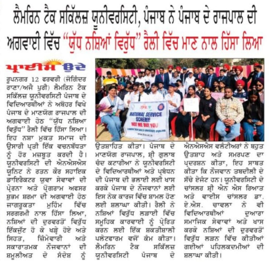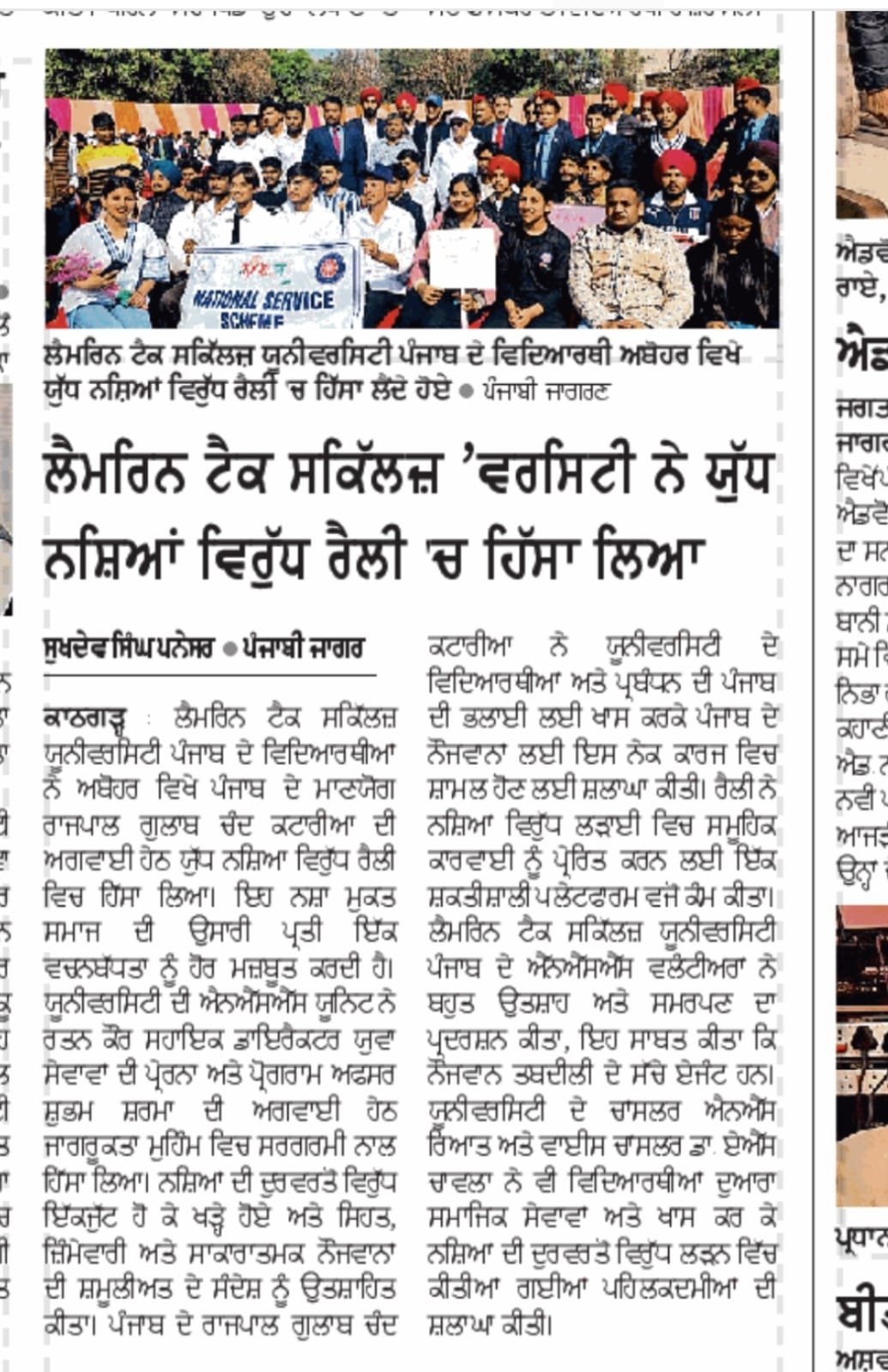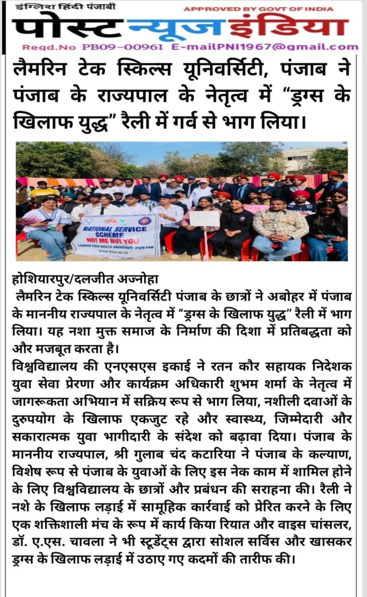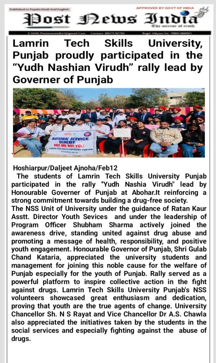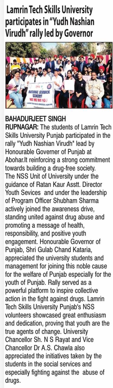 The NSS Unit of University under the guidance of Ratan Kaur Asstt. Director Youth Sevices and under the leadership of Program Officer Shubham Sharma actively joined the awareness drive, standing united against drug abuse and promoting a message of health, responsibility, and positive youth engagement. Honourable Governor of Punjab, Shri Gulab Chand Kataria, appreciated the university students and management for joining this noble cause for the welfare of Punjab especially for the youth of Punjab. Rally served as a powerful platform to inspire collective action in the fight against drugs. Lamrin Tech Skills University Punjab's NSS volunteers showcased great enthusiasm and dedication, proving that youth are the true agents of change. University Chancellor Sh. N S Rayat and Vice Chancellor Dr A.S. Chawla also appreciated the initiatives taken by the students in the social services and especially fighting against the abuse of drugs.