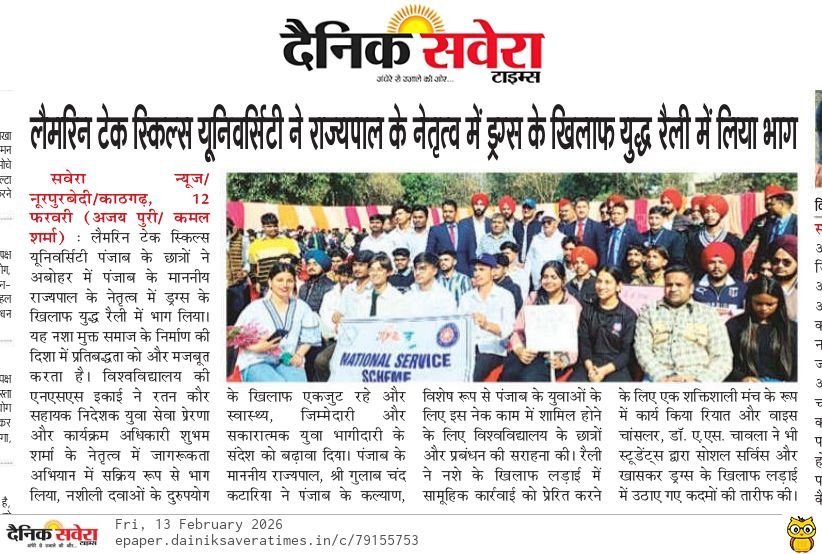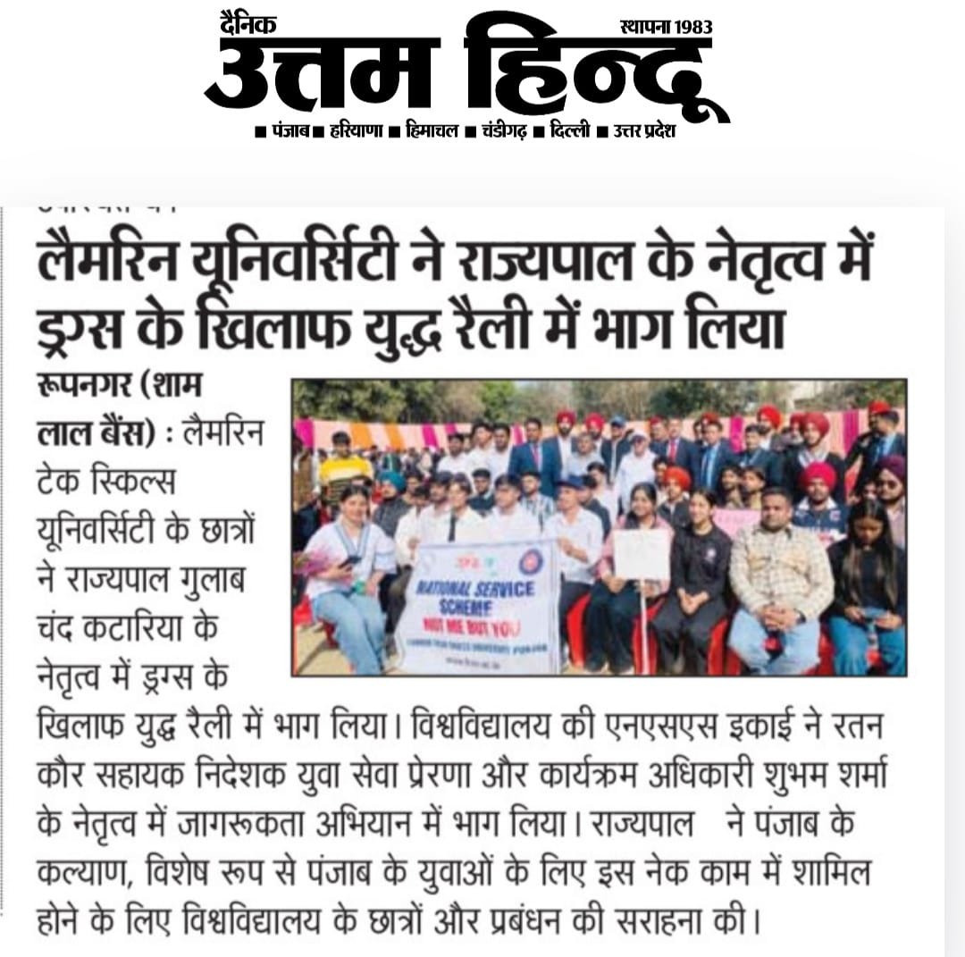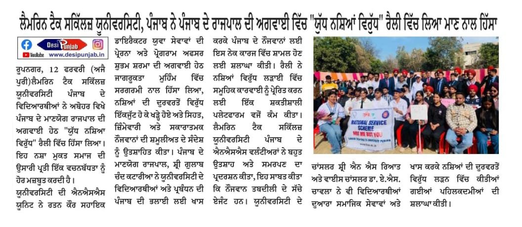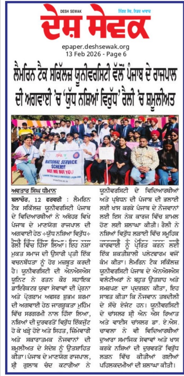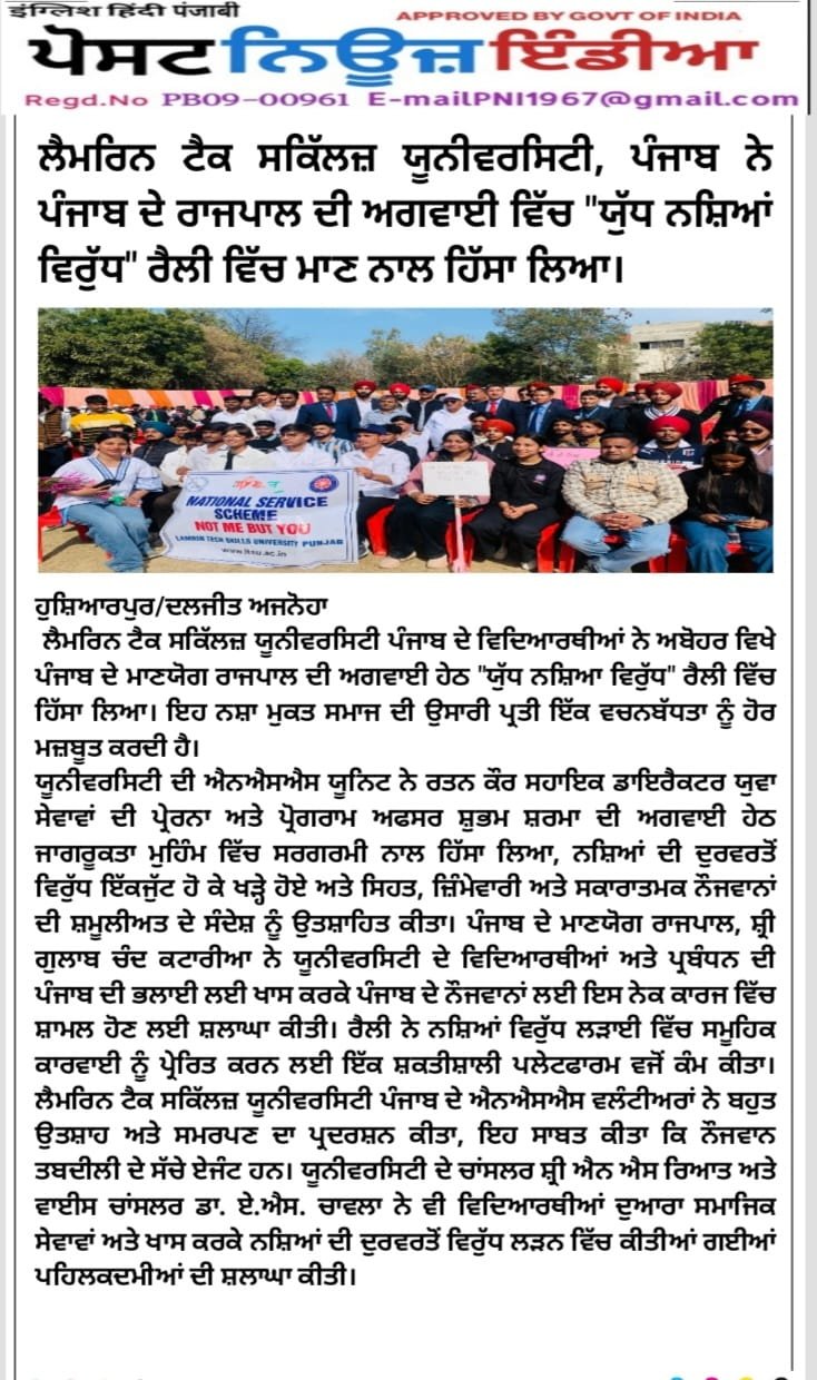 The NSS Unit of University under the guidance of Ratan Kaur Asstt. Director Youth Sevices and under the leadership of Program Officer Shubham Sharma actively joined the awareness drive, standing united against drug abuse and promoting a message of health, responsibility, and positive youth engagement. Honourable Governor of Punjab, Shri Gulab Chand Kataria, appreciated the university students and management for joining this noble cause for the welfare of Punjab especially for the youth of Punjab. Rally served as a powerful platform to inspire collective action in the fight against drugs. Lamrin Tech Skills University Punjab's NSS volunteers showcased great enthusiasm and dedication, proving that youth are the true agents of change. University Chancellor Sh. N S Rayat and Vice Chancellor Dr A.S. Chawla also appreciated the initiatives taken by the students in the social services and especially fighting against the abuse of drugs.