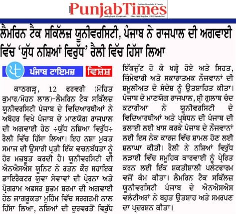 The students of Lamrin Tech Skills University Punjab participated in the rally ''Yudh Nashia Virudh" lead by Honourable Governer of Punjab at Abohar.It reinforcing a strong commitment towards building a drug-free society.