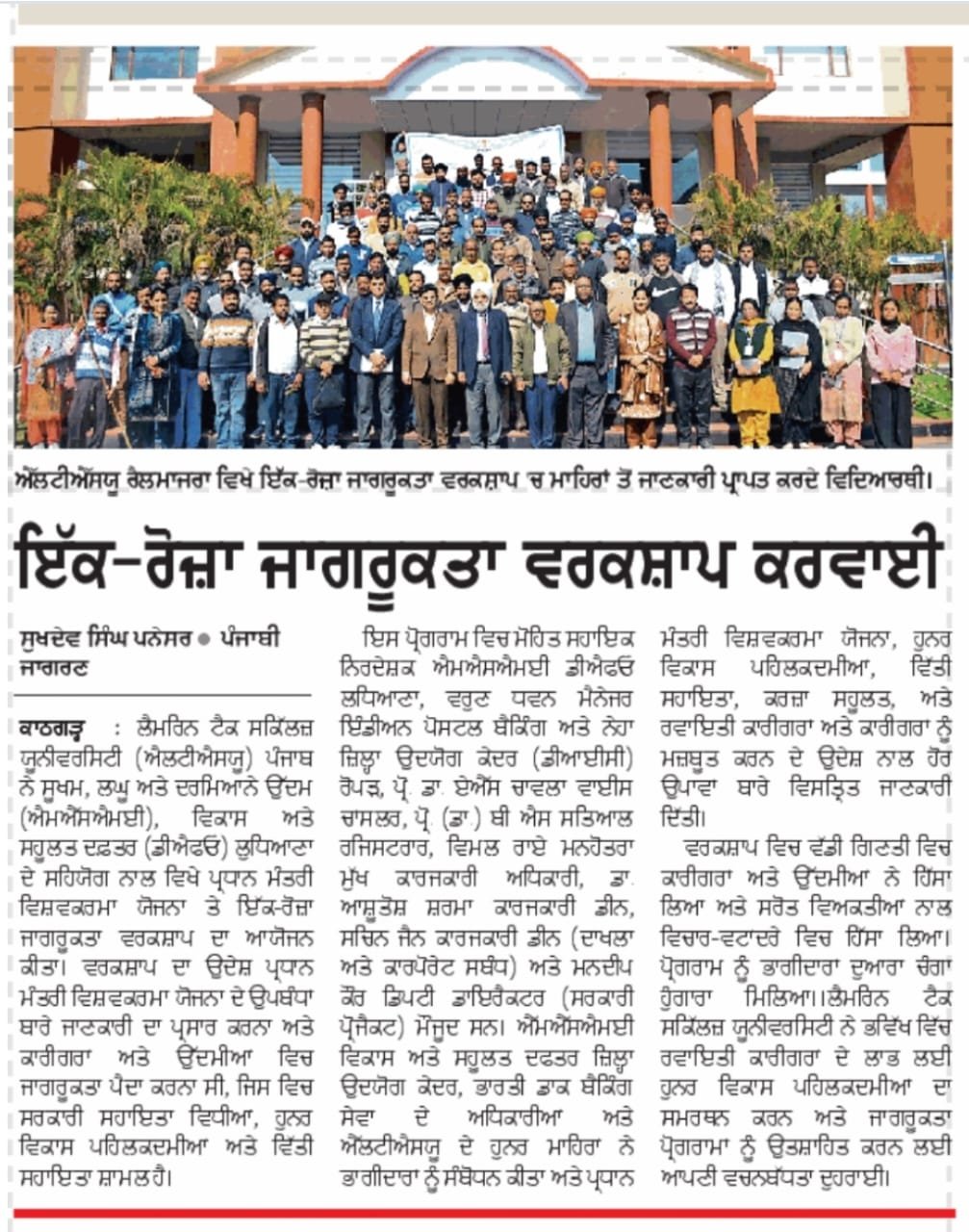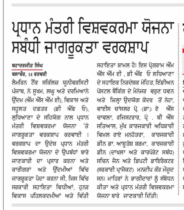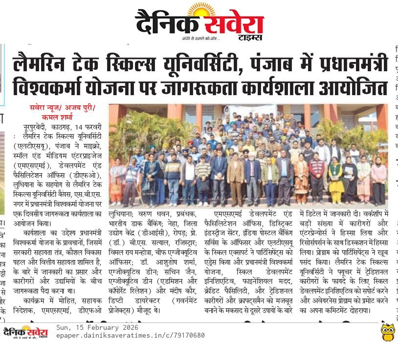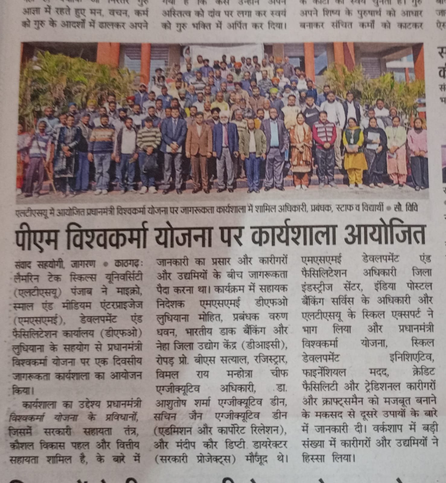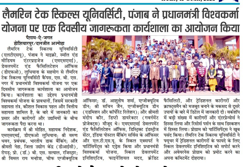 Lamrin Tech Skills University (LTSU), Punjab, in collaboration with the Ministry of Micro, Small & Medium Enterprises (MSME), Development & Facilitation Office (DFO), Ludhiana, organized a One-Day Awareness Workshop on the PM Vishwakarma Scheme at Lamrin Tech Skills University campus, SBS Nagar.